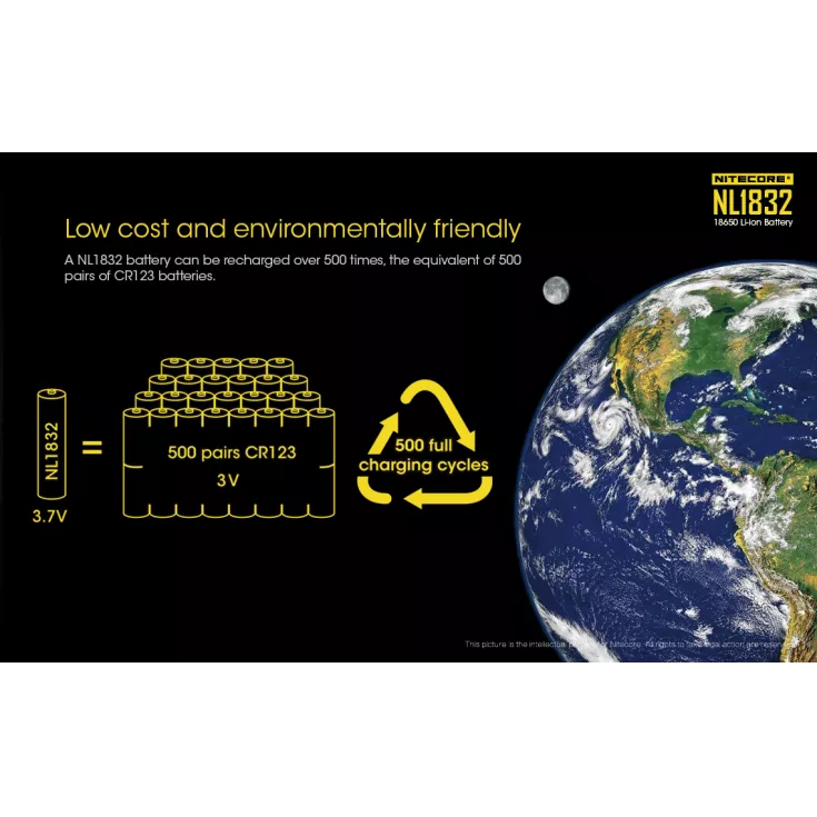 The Nitecore NL1832 18650 is a rechargeable, Li-ion battery with a capacity of 3200mAh.