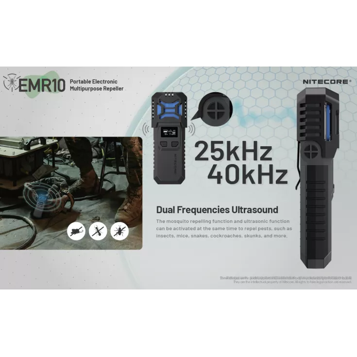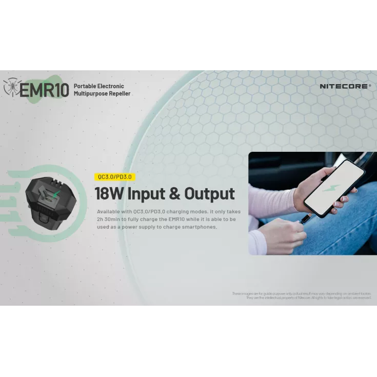 The Nitecore EMR10 portable electronic multipurpose repeller is ideal for keeping away mosquitoes and other pests. Powered by 2 x 21700 li-ion batteries, the device is easily rechargeable via USB-C (charging cable included) and can be used as a power supply to charge your smartphone.