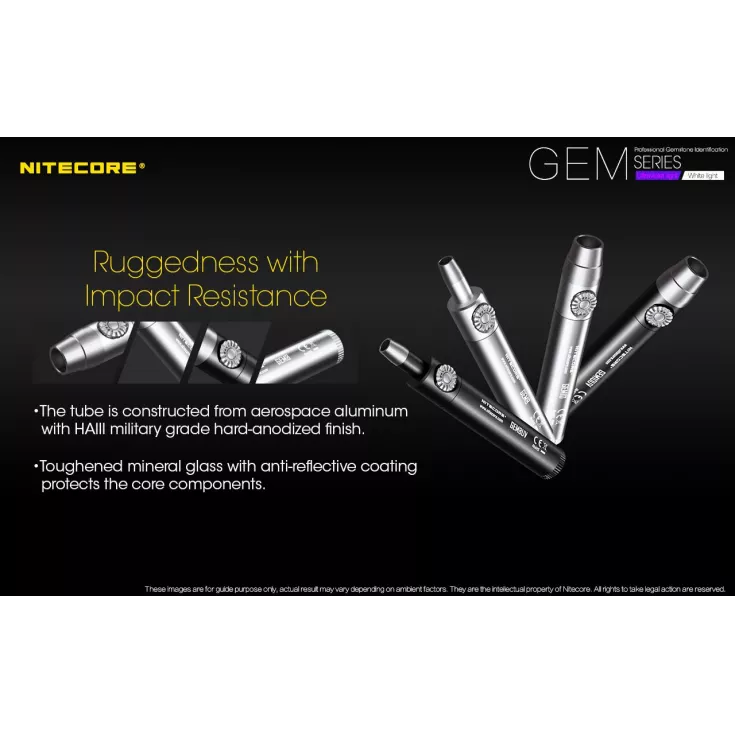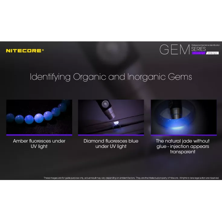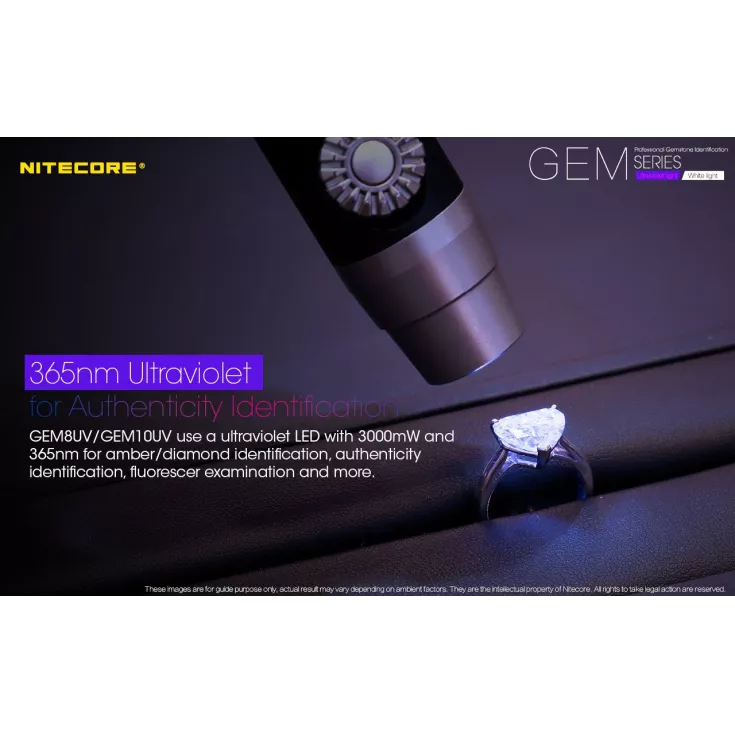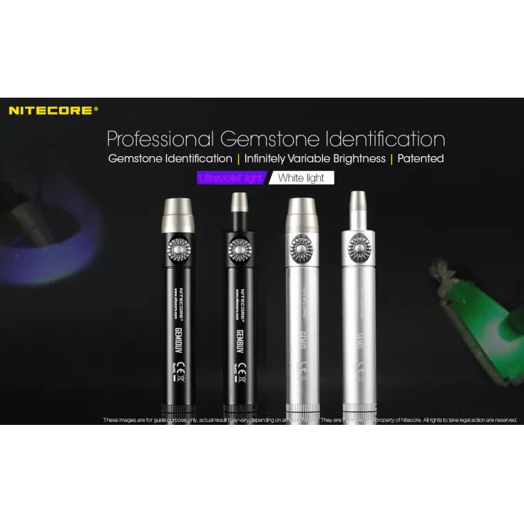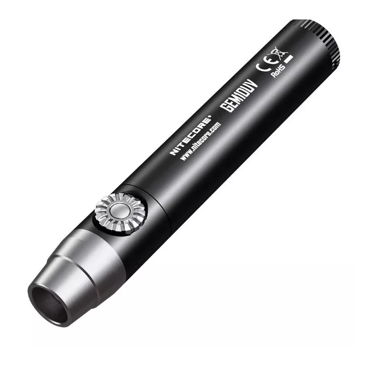 The Nitecore GEM10 UV features a 3000mW, 365nm ultraviolet light and is powered by either 1 x 18650 or 2 x CR123 batteries.