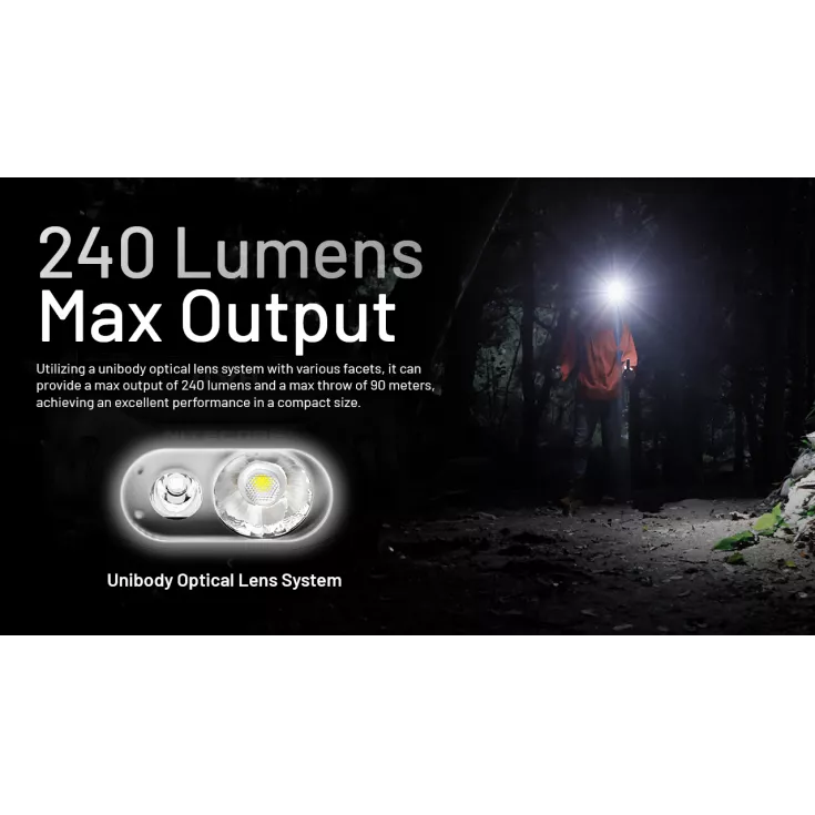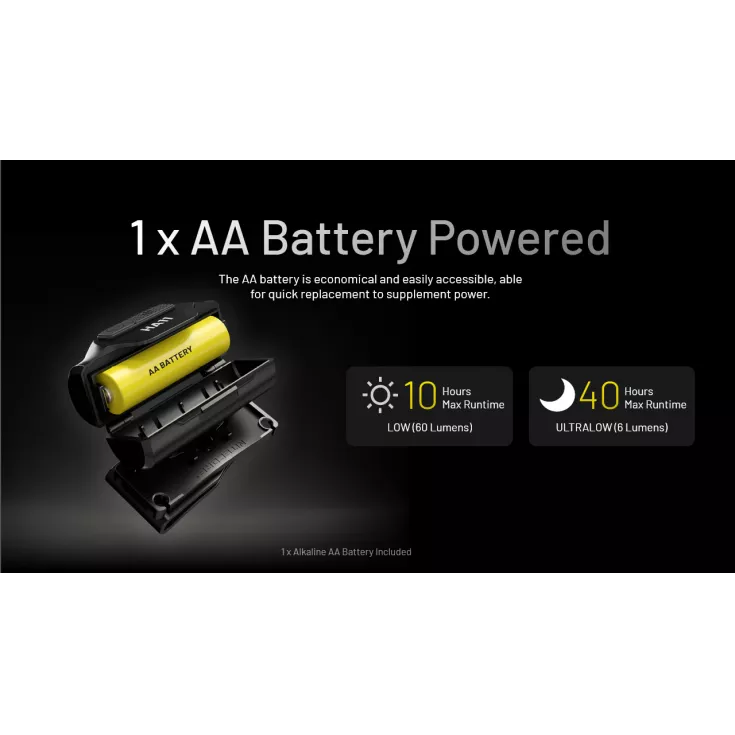 The Nitecore HA11 ultra lightweight dual beam AA Headlamp has a maximum output of 240 lumens and a beam distance of 90 meters. Running on just one AA battery, the HA11 can run for up to 40 hours.