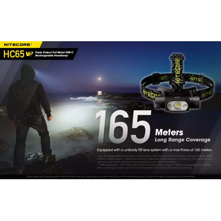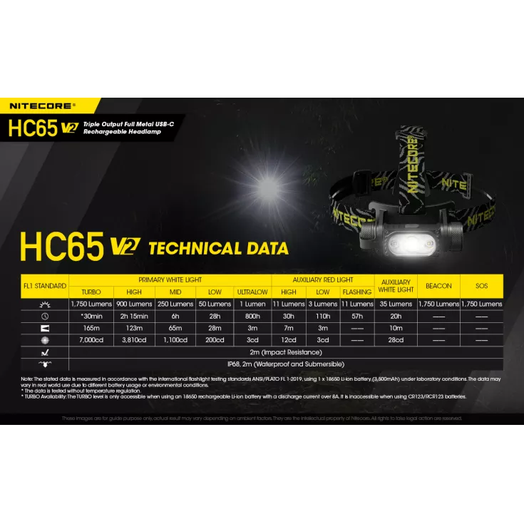 Turbo: 1750 lumens – 30 minutes – 165 meters