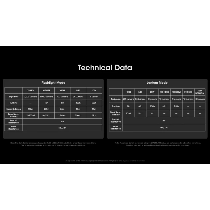 Turbo: 3000 lumens, 300 meters