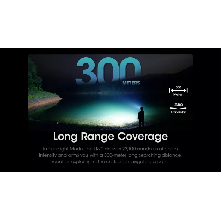 The LR70 has been constructed from alluminium alloy and pc material for a reliable and durable finish. The dual button interface allows you to easily switch between two modes. In flashlight mode, the light delivers 23,100 candelas of beam intensity and a 300 meter long searching distance, ideal for exploring in the dark and navigating a path. When in lantern mode, the LR70 offers a maximum output of 400 lumens with a 360° illumination. It also offers a red beacon and SOS enhancing your visibility in an emergency.