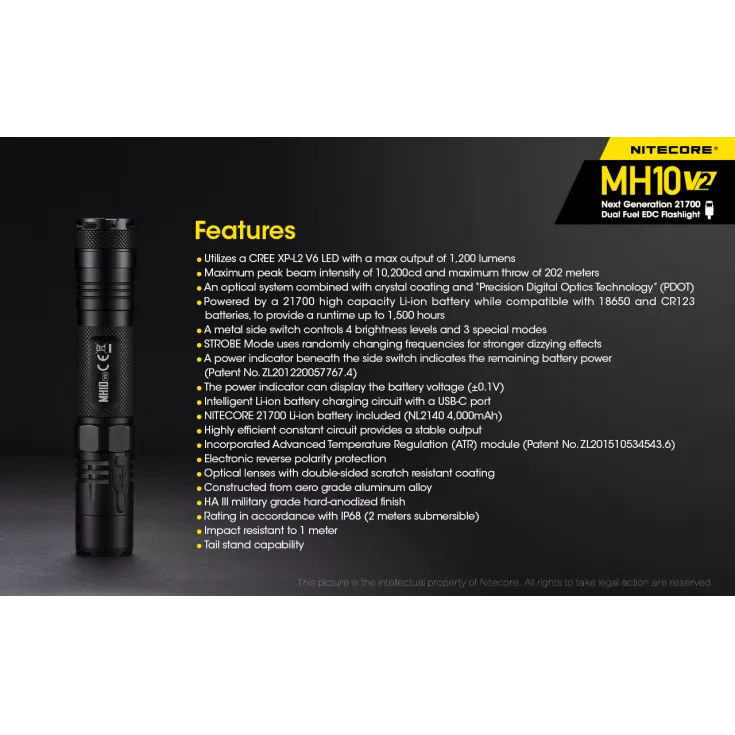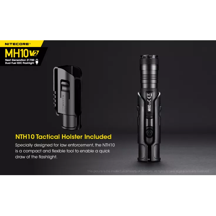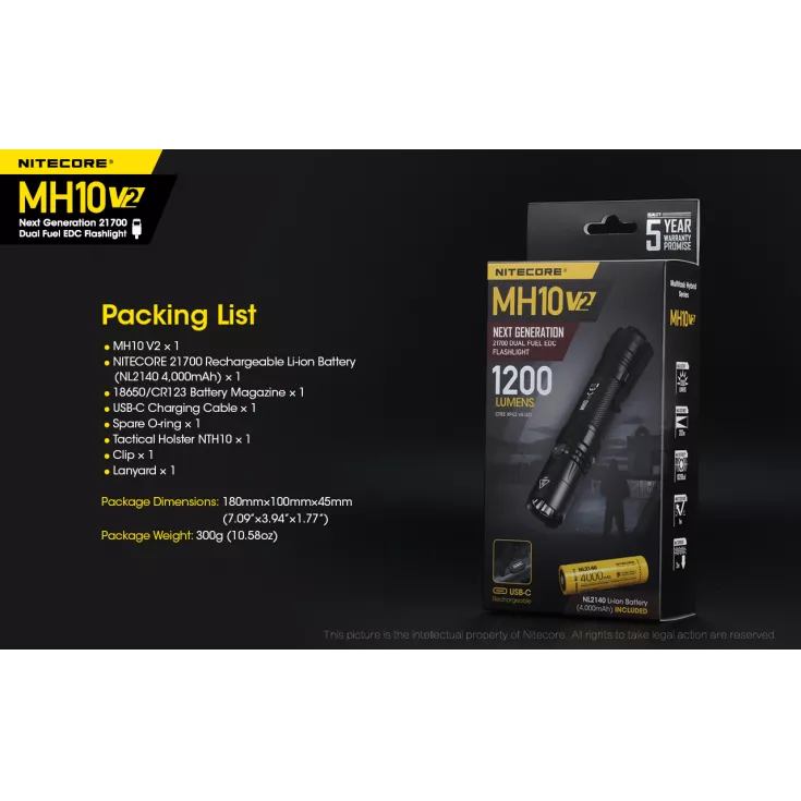 Includes: Nitecore NL2140 21700 4000mAh li-ion battery, 18650/CR123 battery magazine, USB-C charging cable, spare o-ring, NTH10 tactical holster, pocket clip, lanyard.