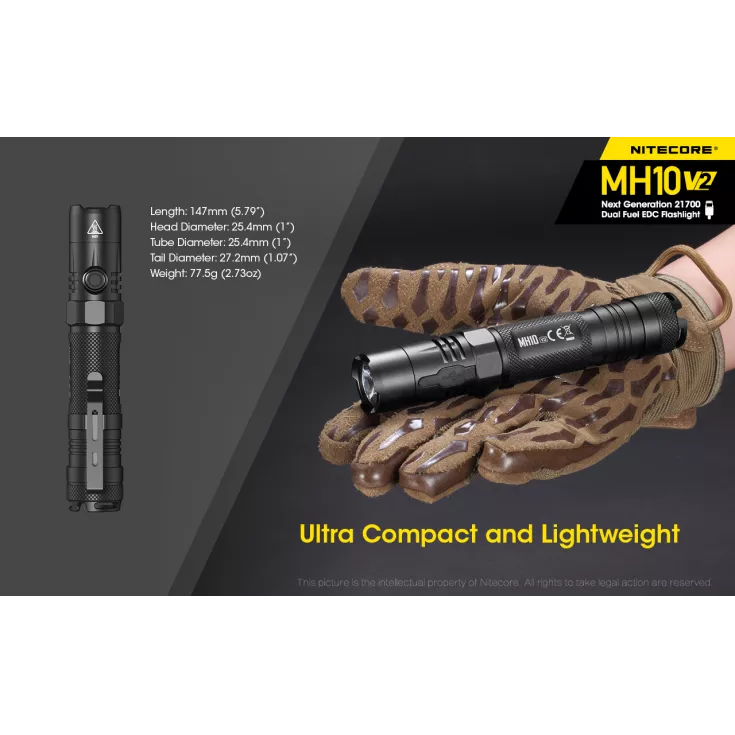 The Nitecore MH10 V2 flashlight is the next generation of the popular MH series, offering versatility, excellent outputs and runtimes and the ideal everyday carry design. The torch has a maximum output of 1200 lumens from the Cree XP-L2 V6 LED and has a choice of battery options. The recommended and included cell is a 21700 li-ion, however 1 x 18650 or 2 x CR123 or RCR123 batteries can be used instead with the included battery magazine.