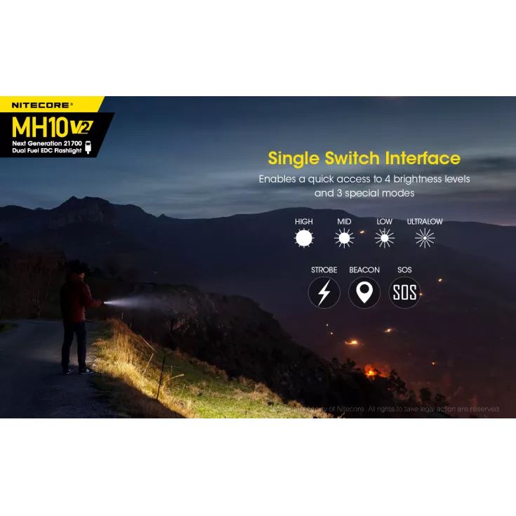 The MH10 V2 features four brightness modes and three special modes, all of which are operated using the single side switch. Additionally, the torch has direct access to the ultralow output and a memory function which automatically accesses the previously used brightness level.