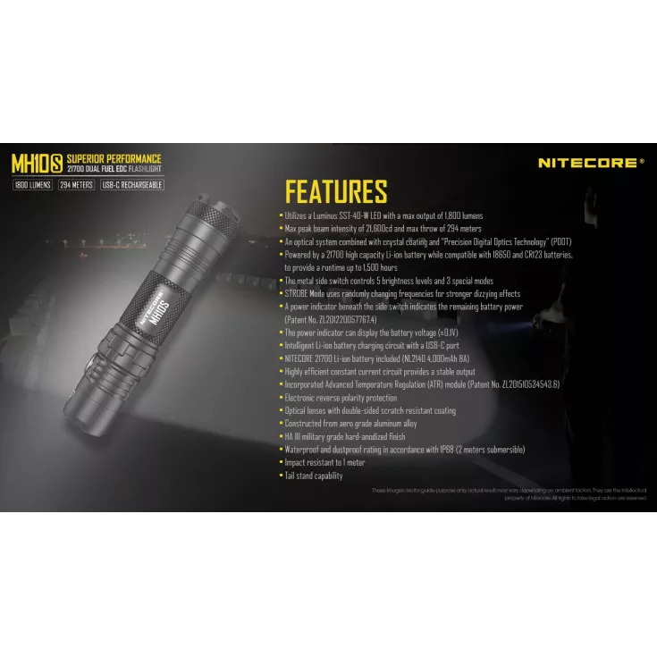 Powered by a single 21700 Li-ion battery the MH10S includes a high capacity 4000mAh 8A cell (NL2140) that charges inside the torch via the supplied USB-C cable. 18650 and CR123A cells are also compatible. In addition to the battery and cable the MH10S includes a removable pocket clip, wrist lanyard and NTH10 hard Tactical Holster.