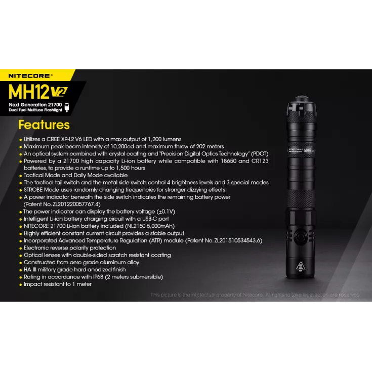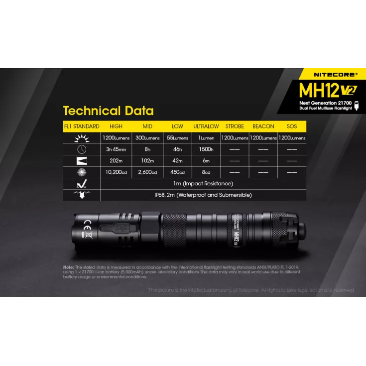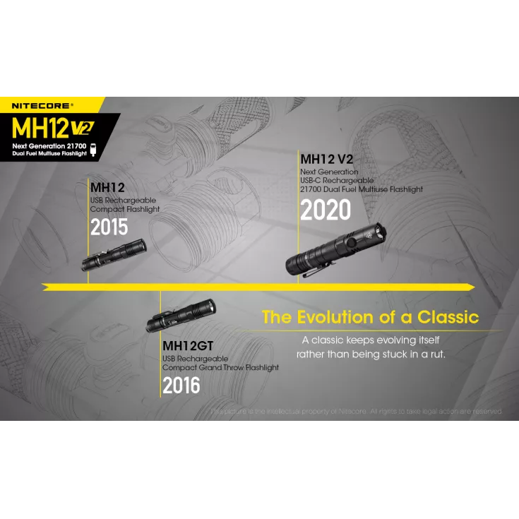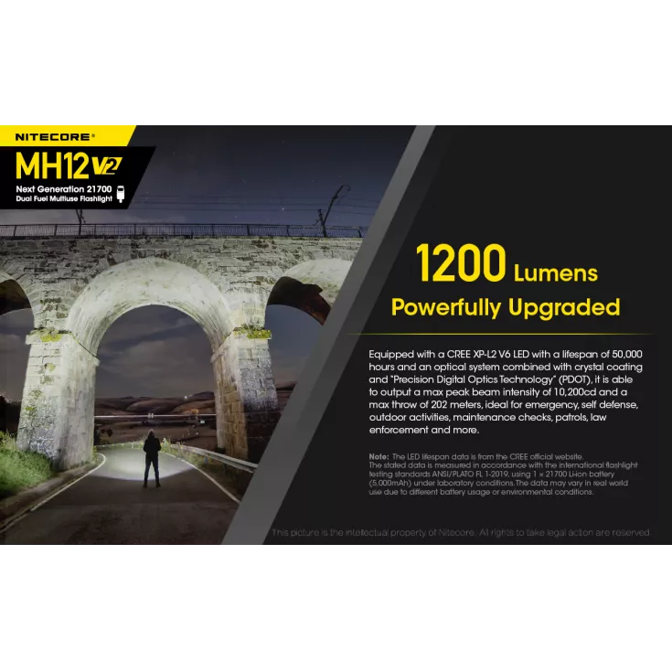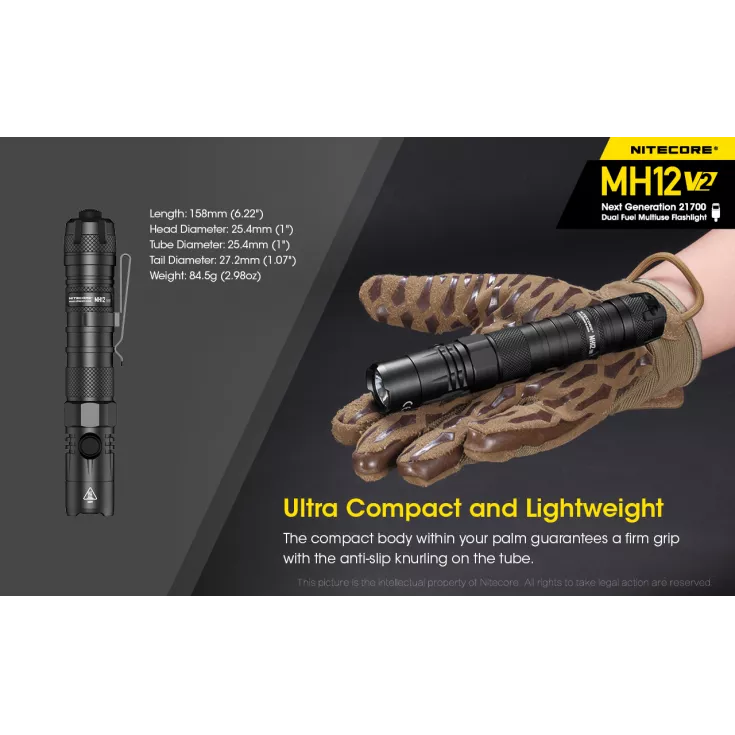 The next model in an evolution of a classic and much-loved torch, the Nitecore MH12 V2 has an improved output, runtime and design than its predecessors. The V2 flashlight has a maximum output of 1200 lumens from the Cree XP-L2 V6 LED and can be powered using 1 x 21700 (included) or 1 x 18650 or 2 x CR123/RCR123 with the included battery magazine.