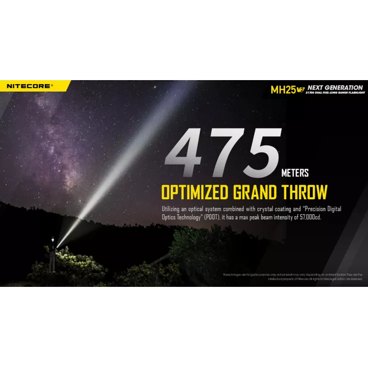 The Nitecore MH25 V2 features a high performance LED with a maximum output of 1300 lumens and a range of up to 475 meters.