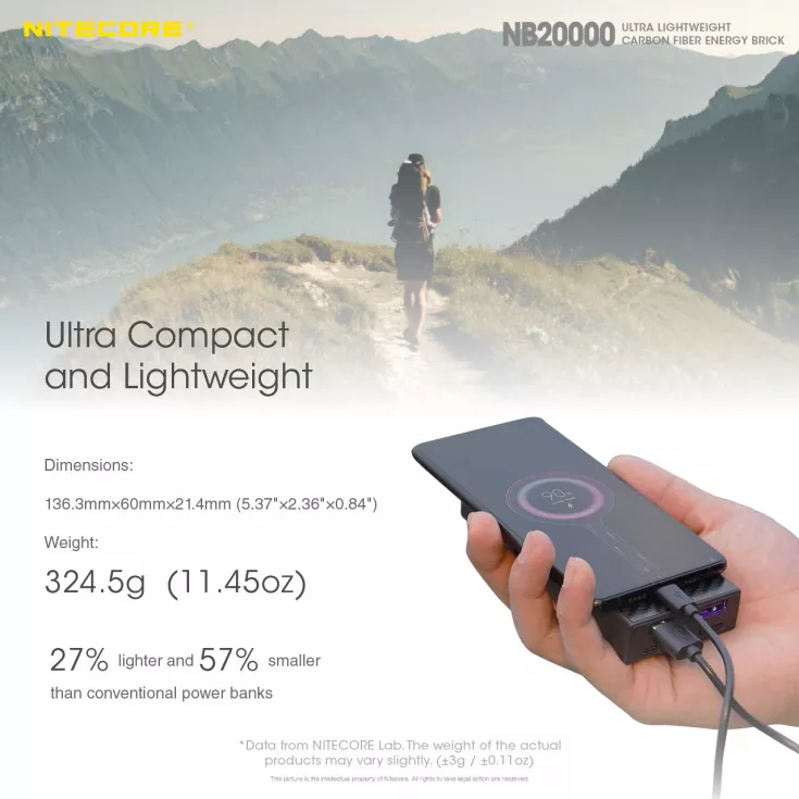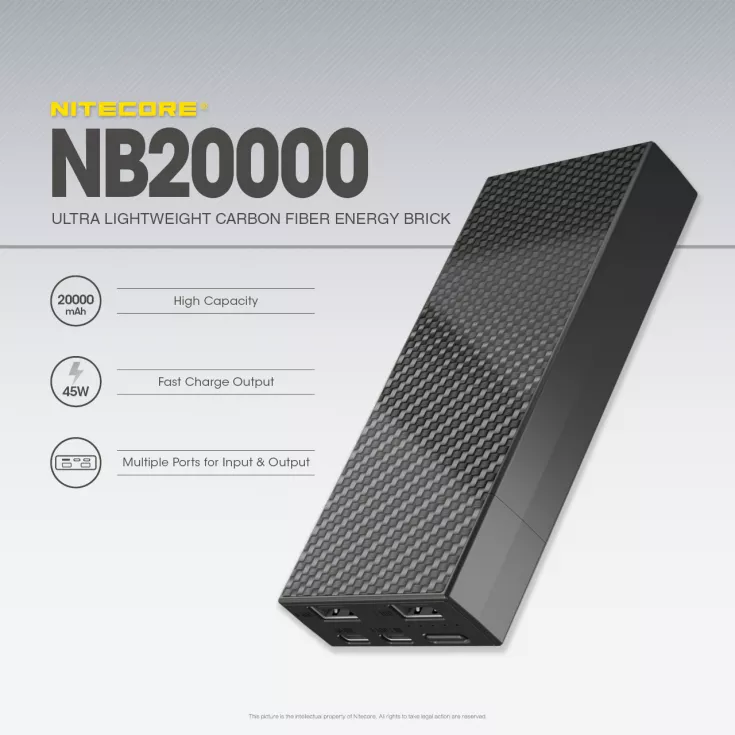 The Nitecore NB20000 is a 20,000mAh power bank that is both light weight and compact, thanks to its carbon fibre reinforced polymer (CFRP) frame and carbon fibre side panels. Weighing in at 324.5 grams and measuring 136 x 60 x 21.4mm.