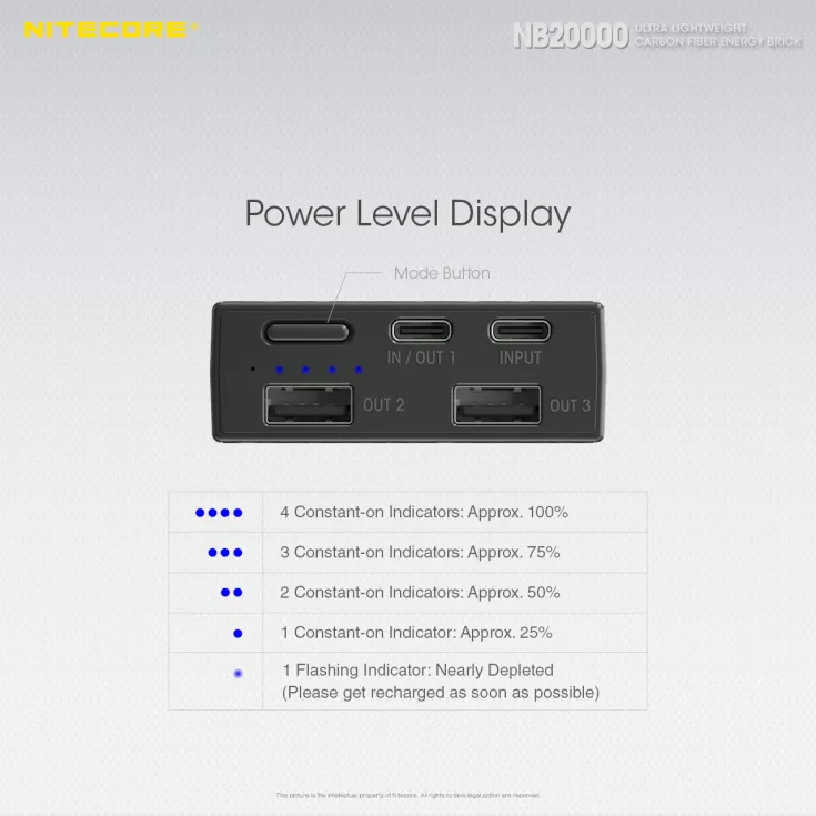 The Nitecore NB20000 has a range of protection safeguards including overcharge protection, over-current protection, over-discharge protection, short-circuit protection, thermal protection and overvoltage protection.