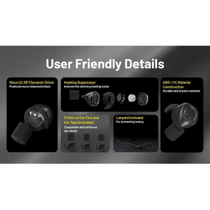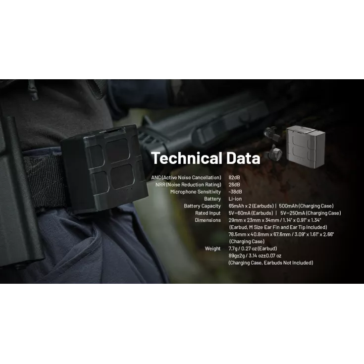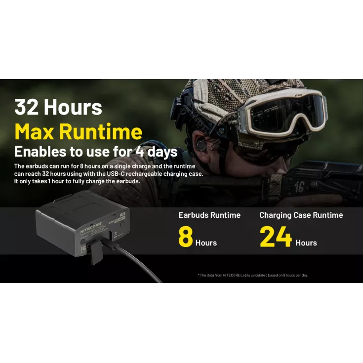 The NE20 comes with a tailor-made charging case specially designed for tactical applications with multiple carry options making them a perfect everyday carry for tactical use such as shooting training . The buds can run for 8 hours on a single charge and a runtime reaching 32 hours when using the USB-C recharging case. The earbuds take just one hour to fully charge.