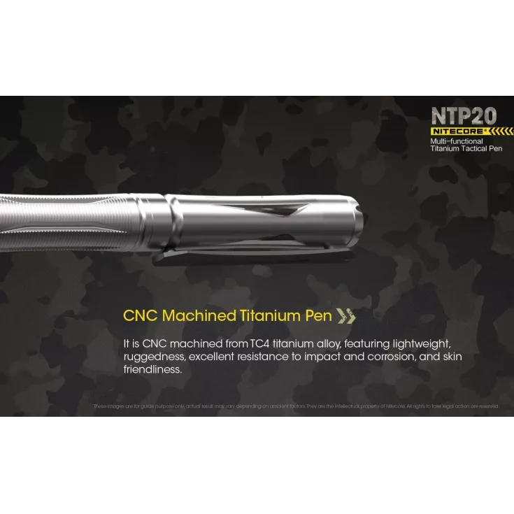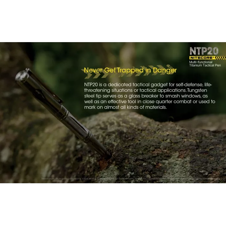 The Nitecore NTP20 is a robust tactical pen, made from durable titanium. The multi-functional tool incorporates a pen and tungsten steel tapered tip for emergency situations. The steel is rated at 89-92.5HRA by the Rockwell scale, coming second only to diamond!