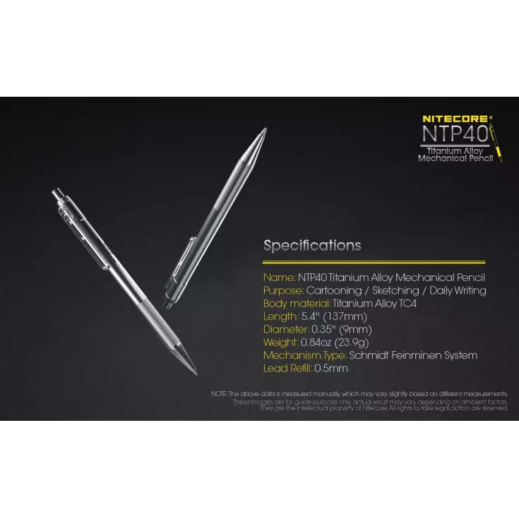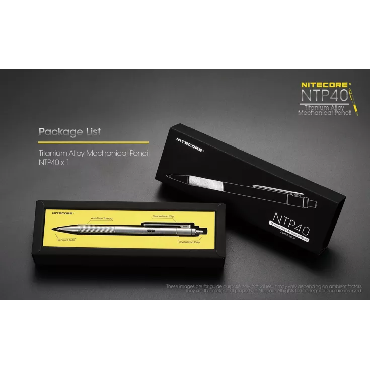 The Nitecore NTP40 is the first titanium pencil, following the success of Nitecore’s tactical pens, such as the NTP21 and NTP30. The ideal instrument for sketching and writing, the pencil gives a smooth and clear output suitable for a range of purposes.
