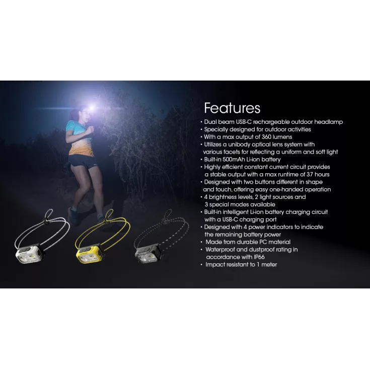 The advanced headlamp features a one-hand operational dual button interface, a user-friendly and tailor-made reflective, glow-in-the-dark headband, high performance LEDs and a red light, making it the perfect headtorch for trail running and other outdoor activities.