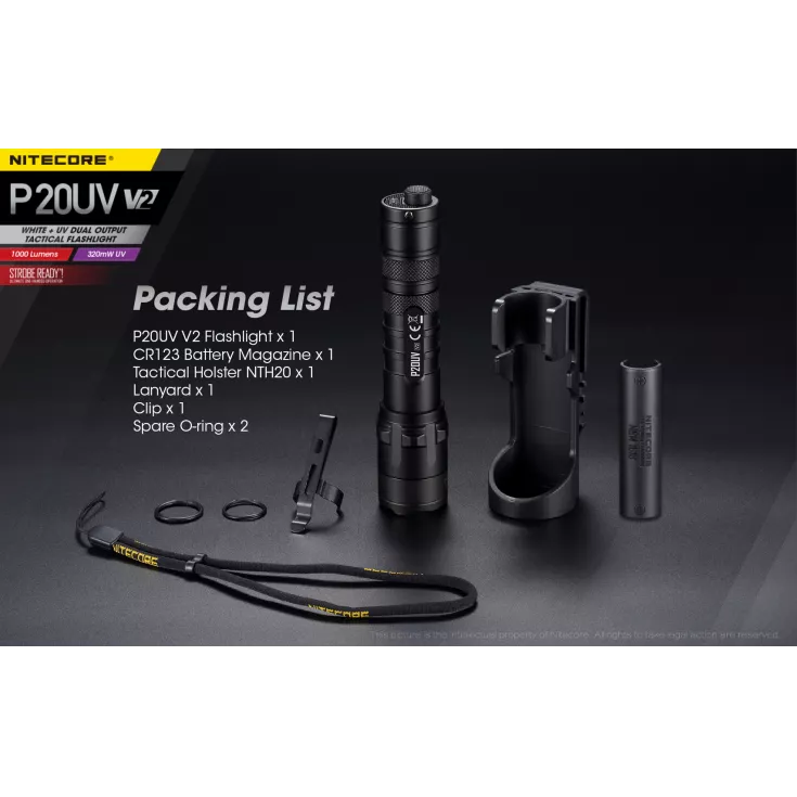 Nitecore P20UV V2 Includes: NTH20 Holster, Removable pocket clip, wrist lanyard, CR123 battery magazine and spare o-rings, 2 x CR123 batteries