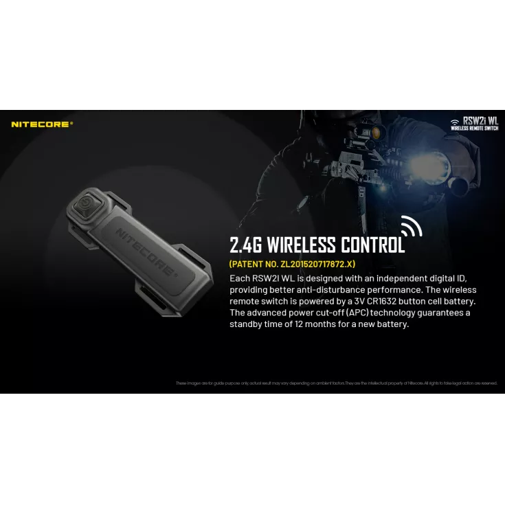 Each RSW2i WL is designed with an independent digital ID creating an undisturbed performance. The switch comes with multiple tactical accessories making it versatile and able to meet all your needs. It is powered by a 3V CR1632 button cell battery, lasting approximately 12 months due to the the advanced power cut-off (APC) technology.