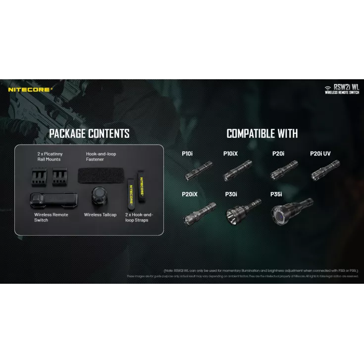 Includes : 1 x wireless remote switch, 1 x wireless tailcap, 2 x hook and loop straps, 2 x Picatinny rail mounts and a hook and loop fastener.