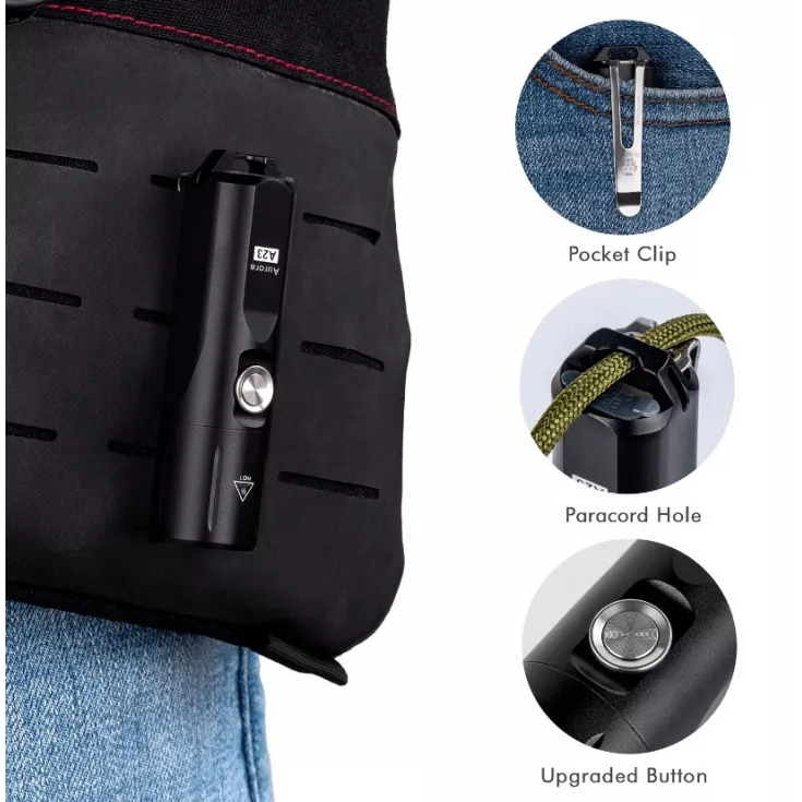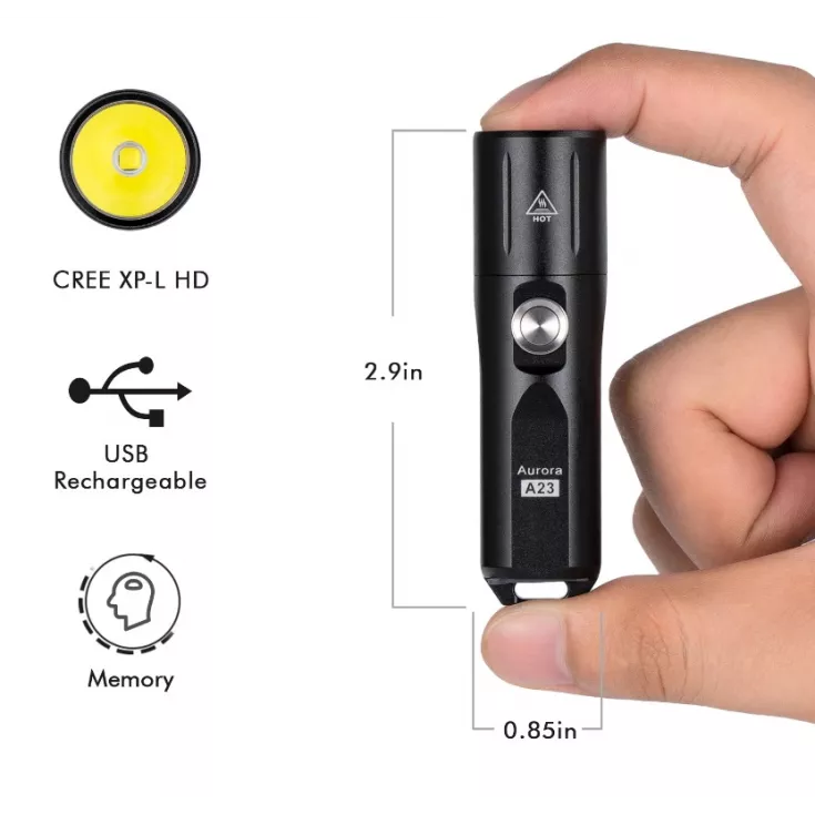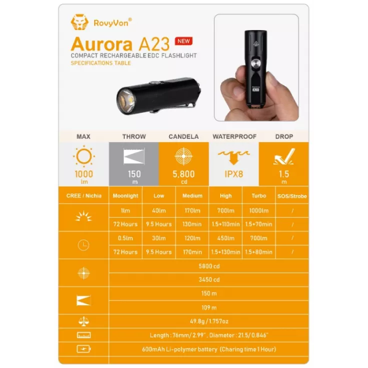 The RovyVon Aurora A23 compact torch has a maximum output of 1000 lumens from the Cree XP-L HD LED and is powered by a rechargeable, lithium polymer battery which comes included with the light. The battery is rechargeable inside the light via a micro USB port on the tail end of the A23 and comes with a charging cable.