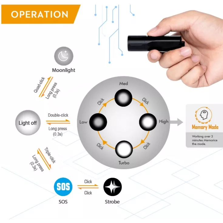 The torch offers five brightness levels, ranging from 1 to 1000 lumens, which are operated by a single side switch. The metal switch provides easy access to the modes and allows for one-handed operation.