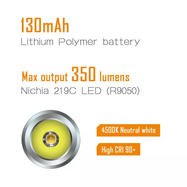 High: 420 lumens – 1 min + 1.5 hrs runtime (Please note, the output will step down to 80 lumens after 1 minute to avoid overheating)