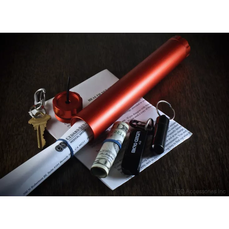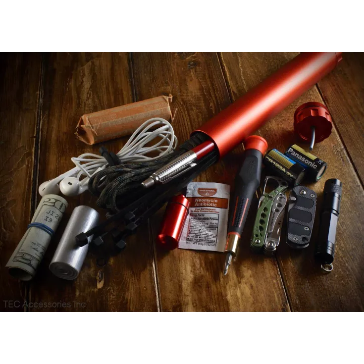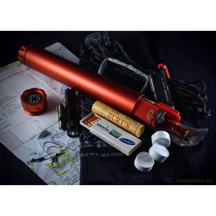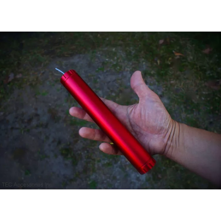 The TEC Accessories D-Cache is an ultra-durable, waterproof storage container, ideal for carrying gear that needs to be keep safe, together and easy to access. Idential in size to a stick of dynamite and made from aircraft grade aluminium, the large canister is bead blasted to a uniform matte finish and then red anodised for an ‘explosive’ look.