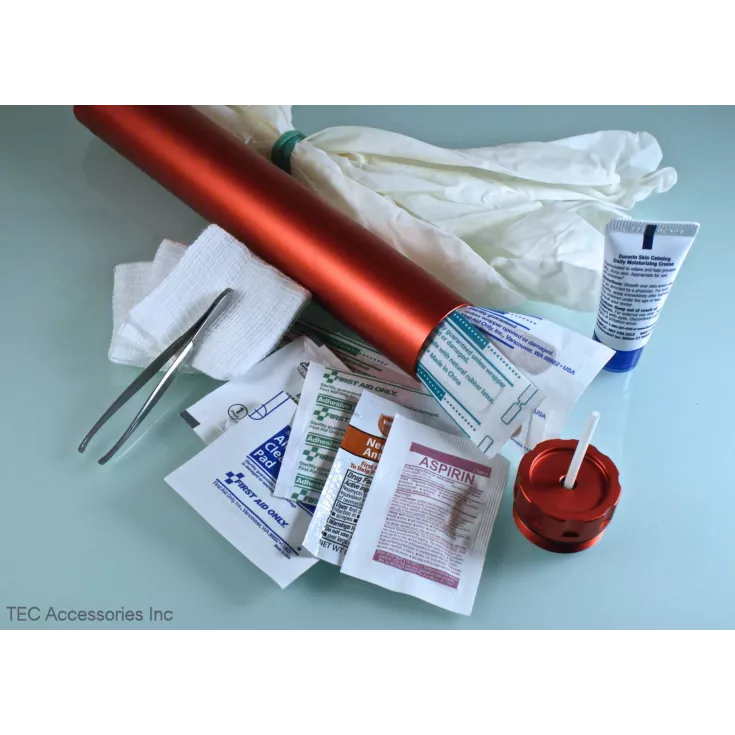 - First Aid Kit: bandages, gauze, medication, medical gloves, creams, alcohol wipes, tweezers