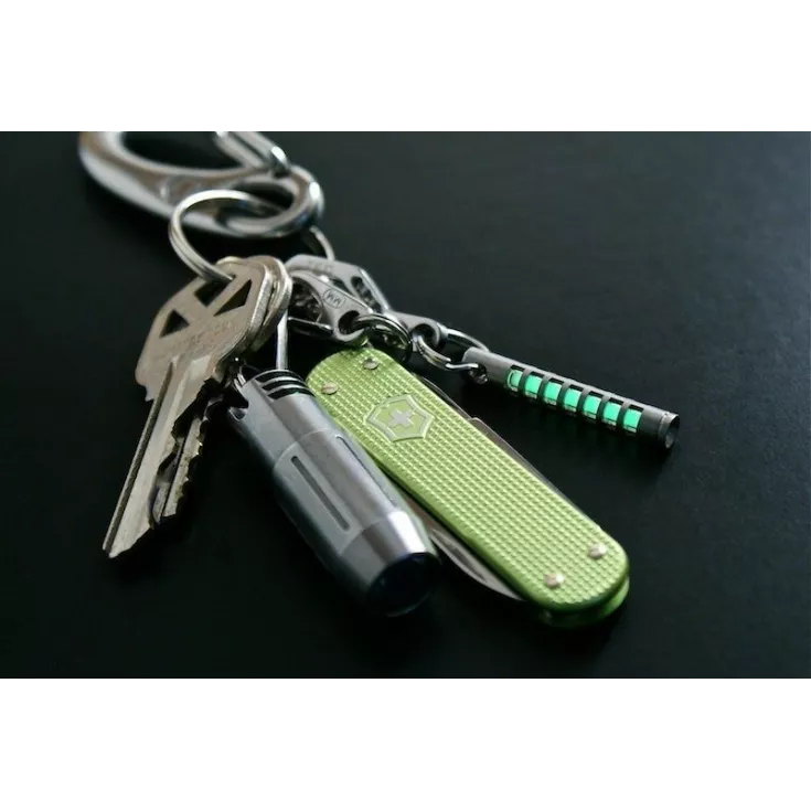Unlike TEC Acessories conventional line of glow fobs, the Isotope was designed around the use of a glass tritium vial. This makes it noticeably smaller than the standard glow fobs, and allows it to glow continuously without any type of charging cycle! The Isotope is a stainless steel housing, bead blasted to a uniform matte finish. There are 7 slots on each side of the housing as well as a hole in the bottom to provide maximum tritium visibility, yet offers superior protection of the glass vial. Once the tritium is installed, you simply insert the included rubber plug (spares included) and attach the split ring. This prevents the tritium vial from sliding out, yet provides an easy way to exchange vials if you want a different color.
