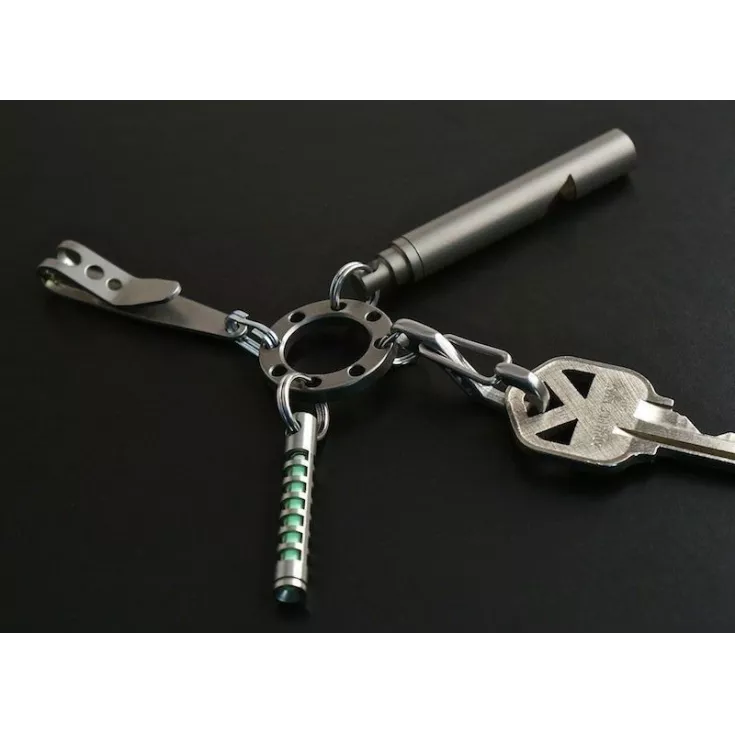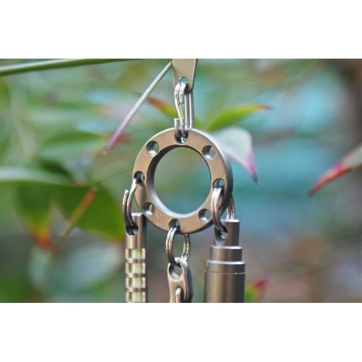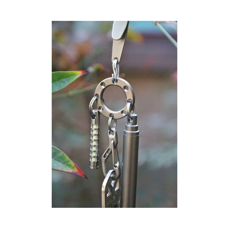 The TEC Accessories UFO or Universal Flex Organizer is a ring of titanium with 8 equally spaced holes around the perimeter for attaching gear. It could be used with a P-7 clip as shown, or as a zipper pull with 2-3 items attached for convenience. Use it to keep your house keys and work keys separate, or even as a key ring that keeps all items separated. It could also be used with paracord looped through the center. It’s shape makes it about as versatile as possible. However you want to organize your gear, the UFO can play a part in making it work for you!